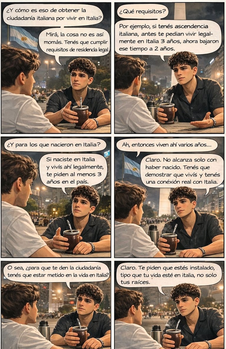El primer cambio es la reducción del tiempo de residencia exigido en algunos casos. En particular, para personas con ascendencia italiana (por ejemplo, descendientes hasta segundo grado), el requisito de residencia legal en Italia baja de tres años a dos años. Esto no elimina la exigencia de vivir en Italia, pero sí acorta el camino para quienes ya tienen un vínculo familiar cercano.