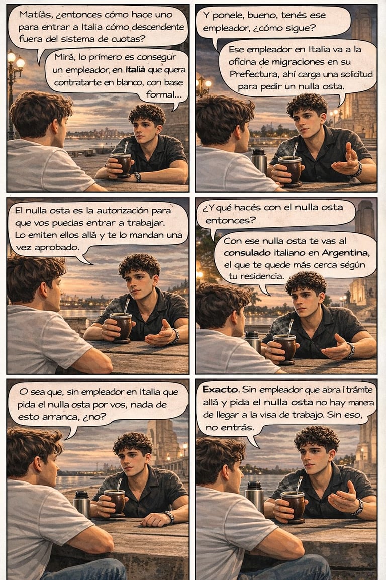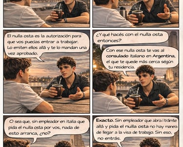 Con ese nulla osta, la persona que está en Argentina va al consulado italiano más cercano según su residencia. Ahí solicita la visa de trabajo subordinado. En esta etapa, el protagonista pasa a ser el trabajador: debe presentar el nulla osta, su documentación personal y cumplir con los requisitos consulares. El consulado no evalúa el contrato desde cero: valida que exista una autorización previa emitida por Italia.